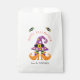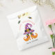 Ce mignon sac de friandise d'Halloween comporte des pieds de sorcière à bottes orange qui sortent d'une étoile casquette sorcière violet spangé. Des petites chauves-souris noires aux ailes vertes et dorées volent de chaque côté. Le texte orange dit "Happy Halloween" en demi-cercle. Un champ de texte supplémentaire se trouve en bas pour vous permettre de customiser. Mignonne, surtout pour les enfants, ou pour toute célébration d'Halloween. Graphiques de Prettygrafik Design, © Prettygrafik.com