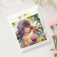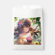 Anime fille avec de longs cheveux bruns, fleurs dans ses cheveux, un rose et chocolat cupcake sacs d'anniversaire.