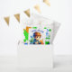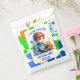 Merci personnalisé pour les sacs. Un mignon petit garçon jouant à des jeux vidéo. Arrière - plan de peinture bleu, vert et orange.