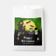 Ce sac de faveur amusant et éffrayant présente de mignons monstres Frankenstein à côté d'une maison hantée. Dans l'arrière - plan est une pleine lune avec des chauves-souris et un ciel de nuit vert avec des étoiles. Le texte combine les polices décoratives et serif pour un look élégant et moderne. C'est parfait pour une fête d'Halloween.