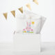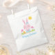 Sacs gâtés de Pâques personnalisés rose mignon avec un lapin de Pâques rose entouré d'un oeuf de Pâques et de tulipes. Mignonne pour votre fête de Pâques. Conçu pour vous par Blackberry Boulevard.