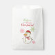 Un sac de faveur conçu pour les friandises de Noël, avec un adorable bonhomme de neige orné d'un chapeau de Père Noël rouge et de nez de carotte, entouré de flocons de neige, et portant la phrase - Croyez en la magie de Noël!