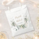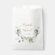 Sacs de faveur élégants pour vos invités de mariage avec des aquarelles d'eucalyptus vert sauge, feuilles de laurier avec des accents dorés, vos noms dans un script doré élégant et votre date de mariage en typographie grise douce moderne.