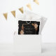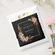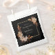 Ce sac de mariage floral noir Favor avec le nom de la mariée et du mariée, date mariage, et "merci" sont décorés à la main d'aquarelle couleur brulée orange et terre cuite feuilles, dahlias crème et beige, et de beaux roses couleur rouille disposés autour d'un cadre carré de faux feuille d'or sur un arrière - plan noir. Trouvez les articles correspondants dans la collection Black Autumn Romance.