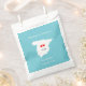 Une carte RSVP amusante mais élégante dans un style bagage tag pour les couples se marier sur le continent espagnol avec une silhouette d'avion sur le bleu turquoise avec des coeurs d'amour rouge sucré et tourbillonnante forme de coeur.