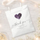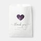 Ces élégants sacs de faveur de mariage modernes ont une forme de coeur remplie d'un agate d'aquarelle violet et d'une parties scintillant en faux or. Les mots "merci" apparaissent dans un élégant script d'écriture manuscrite gris charbon avec des swashes au début et à la fin. Customisez le message et ajoutez les noms du couple et de la date du mariage.