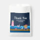 Ce mignon et amusant sac de faveur dispose d'un singe marin sur un pont en bois avec un mouette et un crabe. Dans l'arrière - plan il y a un phare rose et blanc, un oiseau mignon sur un voilier, des vagues de l'océan et un ciel étoilé bleu marine. Le texte combine des polices audacieuses et serif pour un look élégant et moderne. C'est parfait pour une fête d'anniversaire à thème nautique.