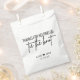 Un sac de faveur de mariage moderne et chic à offrir à vos invités. Il comporte une simple police de caractères indiquant "Merci de nous avoir aidés" suivi d'une calligraphie élégante indiquant "cravate le noeud". Personnalisez-le avec vos noms et votre date de mariage.