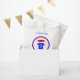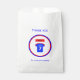Un sac de faveur amusant et coloré pour 7ème anniversaire prêt pour votre texte customisé. La conception circulaire comporte une grande bannière rouge d'anniversaire avec le message "HAPPY BANTHDAY". En dessous, un top sport bleu et rouge, avec un grand numéro blanc 7 et espace pour le nom de l'enfant d'anniversaire. Texte supplémentaire modifiable en bleu, haut et bas sur le sac, dit "MERCI" "pour venir à ma fête".