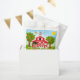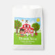 Ce sac à friandises mignon et amusant présente une fille aux cheveux bruns avec une peau foncée à côté d'une grange rouge avec une girouette coq. Il y a des animaux de ferme adorables tels qu'une vache, un cochon et une poule. En arrière-plan, on voit un ciel bleu vif, des pommiers, la lumière du soleil, des papillons et des marguerites. Le texte combine des polices grasses et sans empattement pour un look stylé et moderne. C'est parfait pour une fête d'anniversaire sur le thème de la ferme.