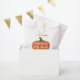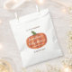 Ces mignonnes sacs de baby shower d'automne ont un citrouille mignon et les mots "UN PETIT CITROUILLE EST EN ROUTE!" en marron et le nom de la future maman et la date du baby shower en blanc. Customisez tous les termes de cette conception.