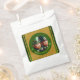 Leprechaun miniature en 3D + "Bonne Saint Patrick" en cercle vert + papier texturé doré (image imprimée) en arrière - plan. Conception sur sac de faveur.