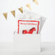 Ce magnifique paquet de sacs de faveur de Noël a une image art numérique d'un mignon cheval à bascule de style scandinave. Le cheval est rouge avec une crinière rouge foncé, la queue et les sabots. Le cheval sympathique sourit. Il a une selle blanche et des rois avec de jolis motifs de style Scandi rouge sur la selle, y compris le soleil, la lune et les étoiles, les coeurs et les fleurs. La base du cheval rocking est rouge et est couverte de feuilles blancs. Le design a été inspiré par le cheval suédois Dala. Il y a du texte personnalisé pour que vous puissiez personnaliser ce design avec votre propre message.