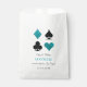 Envoyez vos invités mariages à la maison avec une douceur dans ce sac de faveur entièrement personnalisé avec les noms du couple marié et leur date de mariage en dessous des costumes de carte de parties scintillant bleu noir et faux turquoise.