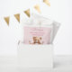 This cute favor bag is a wonderful way to give your friends and family a little treat to take home with them from the Baby Shower. A sweet teddy bear is snuggled into a wicker basket. There are pretty flowers surrounding her as well as a wrapped gift. A pale pink with white polka dot is in the background.