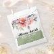 This elegant wedding favor bag showcases a beautiful rhododendron branch adorned with delicate peach-pink flowers and greenery at the upper part. The couple's names are prominently displayed in bold typography, adding a personal touch to the design. A heartfelt message of 'Thank You' is also included, expressing gratitude to the guests. Completing the look, a stylish sage green band gracefully adorns the bottom of the bag, adding a touch of sophistication to any wedding celebration.