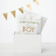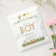 Pour un baby shower garçon avec thème jungle / safari animaux. Dans la partie supérieure, sous une paire de perroquets sur la guirlande de palmiers (une bleue à gauche, une verte à droite), le mot BOY est fait de lettres de bois. A l'intérieur du O il y a un lion mignon. Au-dessus des lettres en bois, il y a les mots "c'est un" écrits dans une écriture manuscrite verte. Au centre, les mots "Merci" sont écrits dans le même script vert, le nom et l'occasion aussi vert (mais pas le script) et la date est gris. Dans la partie inférieure, il y a des animaux de la jungle : une girafe, un éléphant, et un zèbre (peint en aquarelle), avec derrière eux le feuillage de la jungle (feuilles de monstères). Sur le dos, il y a les mêmes animaux et feuilles. Les animaux sont générés avec DALL-E 2 de OpenAI. J'ai le droit d'utiliser mes générations pour n'importe quel usage légal, y compris à des fins commerciales, et de les incorporer dans mes oeuvres. Les feuilles exotiques sont de Pixabay et sont gratuits pour un usage commercial.