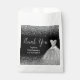 A beautiful silver themed elegant watercolor dress gown on a black background with faux glitter at the top and bottom of the favor bag.