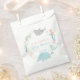 Sous les sacs de baby shower à thème mer, on trouve une baleine, un requin tigre, de la gelée, une tortue de mer et un hippocampe qui nagent en cercle avec de l'herbe de mer et des coquillages.