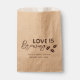 Ajoutez une touche charmante et personnelle à votre fête de fiançailles avec ce sac-cadeau "L'amour se prépare". Avec un design rustique, ce sac présente un graphique fantaisiste de grains de café et la phrase sincère “L'amour se prépare” en haut. Parfait pour contenir de petites douceurs comme du thé, du café ou des friandises, il est entièrement personnalisable avec le nom de la mariée et la date de l'événement pour rendre votre fête encore plus mémorable.