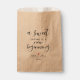 Chic "Une fin douce à un nouveau début" sacs de faveur de mariage. Le design est composé d'un mélange de calligraphie chic et de style moderne avec un petit coeur mignon. Personnalisez le design en changeant les noms, la date et un hashtag. Des produits de coordination tels que sacs de faveur, étiquettes de vin, etc sont également disponibles dans notre magasin.