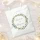 Sac de faveur de mariage personnalisé avec des noms dans une calligraphie script à l'intérieur d'une couronne botanique d'aquarelle peinte en vert, jaune et rose.