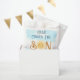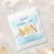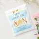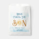 Le sac de faveur baby shower de ce mignon garçon comporte le texte "Here Comes The Son" dans la typographie rétro avec un soleil d'aquarelle jaune souriant et ciel bleu. Facile à personnaliser. Parce que nous créons notre oeuvre, vous ne trouverez pas cette image exacte d'autres designers. Aquarelle originale © Michele Davies.