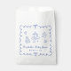 De mignons sacs de faveur pour votre bébé douche garçon avec un cadre bleu français ondulé orné de coquettes, des illustrations fantaisistes dessinées à la main de coeurs, étoiles, décor de gâteau et de pépinière, et le nom de la mère à être présenté dans un script bleu amusant et ludique.