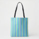 Un motif rayé coloré en aqua, bleu, rose et or. Ce sac à provisions de qualité a une anse noire.