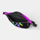 Un corbeau debout et orienté vers la gauche, tenant un bâton magenta avec son aile, devant plusieurs rayons lumineux colorés.
