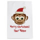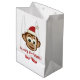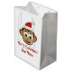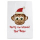 Sacs cadeaux de Noël au singe du Père Noël. Caricature de chimpanzé avec de grands yeux et des oreilles. Amusant Conception de vacances pour les enfants. Couleur arrière - plan blanche ou personnalisée. Personnalisez avec votre propre nom et salutation.