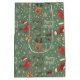 Sacs cadeaux de Noël, très festifs ornés de rennes et de santas dans un élégant arrière - plan d'olivier clair. Le sac cadeau est offert en différentes tailles pour convenir à votre cadeau.