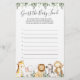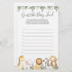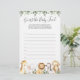 Baby shower à thème pour animaux Safari devinez la carte de jeu de nourriture pour bébé avec une aquarelle animaux safari illustration et aquarelle vert eucalyptus garland et élégante police manuscrite.