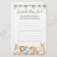 Baby shower à thème pour animaux Safari devinez la carte de jeu de nourriture pour bébé avec une aquarelle animaux safari illustration et aquarelle vert eucalyptus garland et élégante police manuscrite.