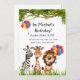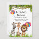 Faites de la fête d'anniversaire de votre enfant une aventure safari avec cette conception d'invitation. Composé d'une gamme d'animaux de la jungle, dont une girafe, un lion et un zèbre.