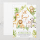 Voici une invitation de baby shower frais avec des animaux de safari mignons arrangés avec des feuilles tropicaux frais verdure