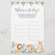 Baby shower à thème pour animaux Safari devinez ce qui est dans la carte de jeu de sac avec une aquarelle safari animaux illustration et aquarelle vert eucalyptus garland et élégante police manuscrite.