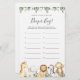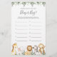 Baby shower à thème pour animaux Safari devinez ce qui est dans la carte de jeu sac de couches comprend une aquarelle safari animaux illustration et aquarelle vert guirlande eucalyptus et élégante police manuscrite.