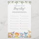 Baby shower à thème pour animaux Safari devinez ce qui est dans la carte de jeu sac de couches comprend une aquarelle safari animaux illustration et aquarelle vert guirlande eucalyptus et élégante police manuscrite.