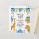 Cette invitation baby shower "sauvage" du safari dans la jungle à thème du garçon comprend des animaux à fausse feuille d'or (girafes, lions et singes), des feuilles de jungle dorée et bleue, et un arrosage de confettis d'or sur un arrière - plan blanc. Ajoutez le nom de la future maman et les détails de la douche en texte noir.