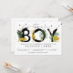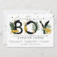Invitation moderne avec feuilles de palmiers et silhouettes d'animaux safari d'or.