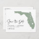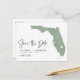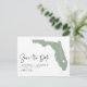 Annoncez votre date de mariage à votre famille et amis avec ce thème d'état Floride enregistrer la date annonce carte postale. Il présente une illustration de l'état de la Floride, la typographie simple et l'écriture manuscrite. Personnalisez en ajoutant les noms, la date, le lieu et d'autres détails. Cet état vert sage de la Floride enregistrer la carte de date est parfait pour tout thème mariage.