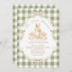 Celebrate the sweet arrival of a little one with this sage green gingham baby shower invitation featuring a watercolor mommy and baby bunny, framed by soft florals, daisies, and ribbon accents.