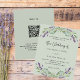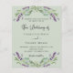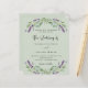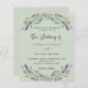 Un arrière - plan vert sage décoré de fleurs de lavande et de verdure d'eucalyptus. Personnalisez et vos noms et détails. Retour : ajoutez votre URL web à votre site web mariage pour RSVP et plus de détails. 1 feuille = 1 invite imprimé bord à bord.