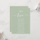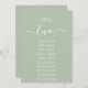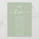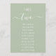In the upper part, there is the table number written in a handwriting script and the word Table above, in smaller caps (hand letters). Under them, there are the 10 guest names, in similar hand letters. The background is sage green, all text is white.