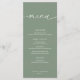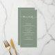 Le menu moderne et élégant est décoré dans un style vert et blanc sage. Personnalisez avec le menu de votre événement avec le modèle facile à modifier avec une police de script élégante et une police serif classe. Découvrez les objets correspondants dans la collection "Modern Elegant".