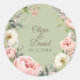Elegant round sticker featuring watercolor blush and ivory peonies with greenery on a soft sage green background. Perfect for sealing envelopes, wedding favors, or adding a romantic botanical touch to your stationery suite.