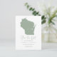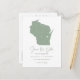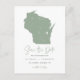 Annoncez votre date de mariage à votre famille et amis avec ce thème d'état Wisconsin enregistrer la date annonce carte postale. Il présente une illustration de l'état du Wisconsin, une typographie simple et un script manuscrit. Personnalisez en ajoutant les noms, la date, le lieu et d'autres détails. Cette sauge vert état du Wisconsin enregistrer la carte de date est parfait pour tout thème mariage.