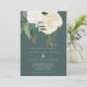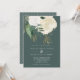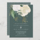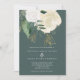 Une faire-part de mariage moderne et romantique, parfaite pour un mariage d'automne ou d'hiver. Ce design présente une cascade de roses d'aquarelle en blanc et ivoire, de feuilles verts et un piqué de fausse parties scintillant, sur un arrière - plan vert sauge foncé. L'inverse est également en vert foncé solide.