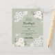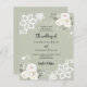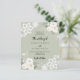 Pour une mariage élégante et romantique. Un arrière - plan de couleur verte sage décoré de fleurs blanches, de roses et de dentelle blanche. Personnalisez et ajoutez vos noms et détails. 1 feuille = 1 invite imprimé bord à bord.